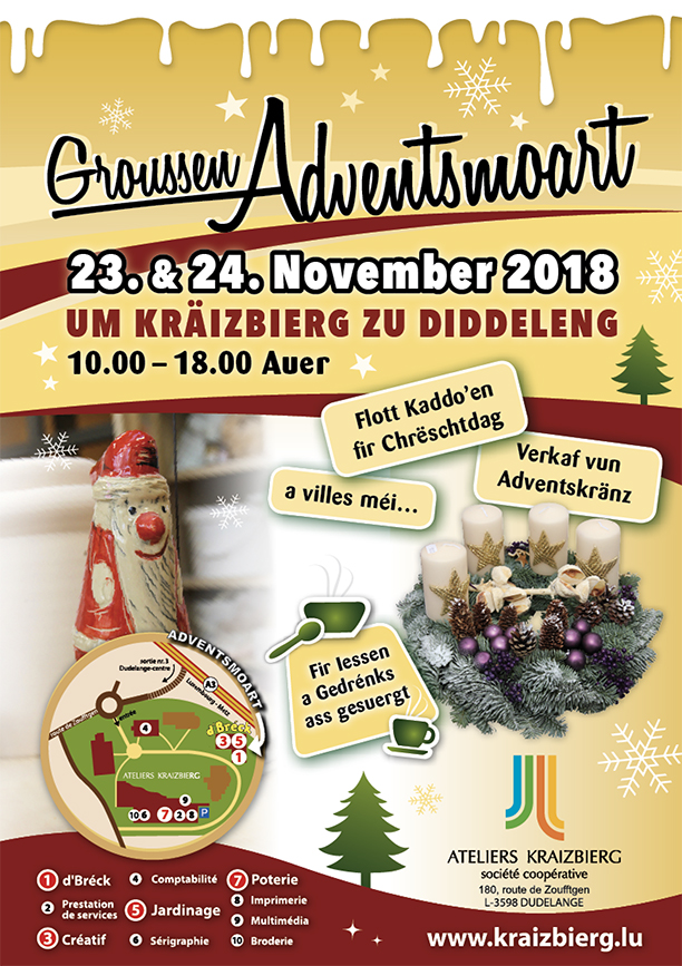 Wéi all Joer organiséieren d'Ateliers Kraïzbierg och dëst Joer den 23 an 24 November hiren groussen Adventsmoart,